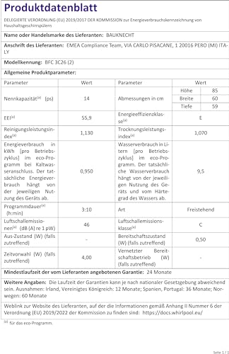 Das Bauknecht-Gerät ist ein sehr energieeffizienter Geschirrspüler, der mit Energieklasse E eingestuft wird. Die Einstufung bezieht sich auf die neuen Energielabel. Im Eco Modus hat er ein Wasserverbrauch von 9,5 Litern. Mit einer Lautstärke von 46 dB ist er Dank der Silent-Technologie recht leise.