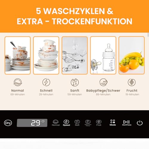 - 6 WASCHZYKLUS OPTIONEN & TROCKEN-MODUS: Unterstützt Normal, Schnell, ECO, Schwer/Babypflege, Trocken-Modus und Frucht Modi für ihre verschiedenen Geschirr Bedürfnisse; nach jedem Waschzyklus, bietet ein extra Trocken-Modus eine zusätzliche 60 Minuten Trocknung, und bietet 72-Stunde belüfteten Lagerung, um Gerüche zu verhindern und Ihr Geschirr sauber zu halten