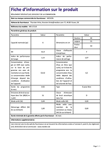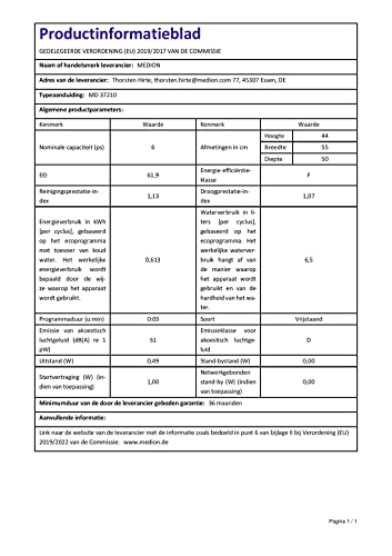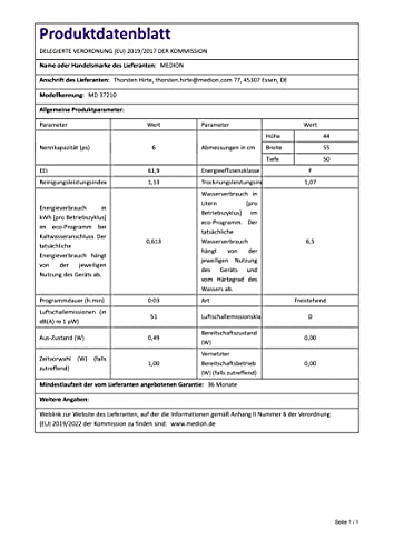 - Lieferumfang: Tisch-Geschirrspüler MD 37210, Geschirrkorb, Besteckkorb, Wasserzulaufschlauch mit Schlauchverbindung, Wasserablaufschlauch, Trichter zum einfachen Befüllen des Salzes